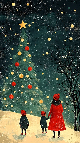 冬夜圣誕樹下母子三人