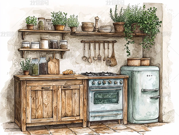 水彩風格的鄉(xiāng)村廚房