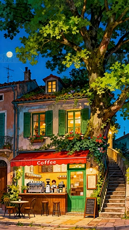 夜晚經(jīng)營(yíng)中的咖啡店插畫(huà)
